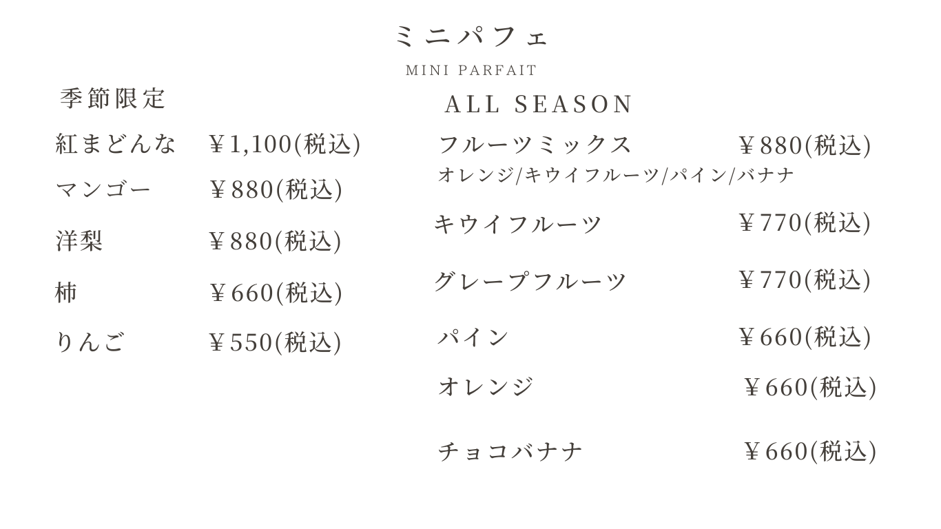 パフェやフルーツサンド、ジュースがお楽しみ頂けます