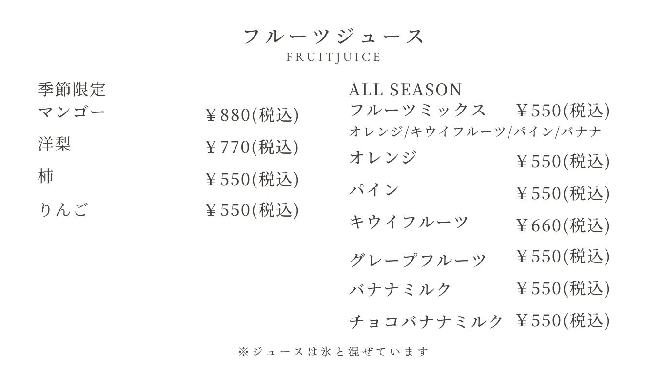 パフェやフルーツサンド、ジュースがお楽しみ頂けます