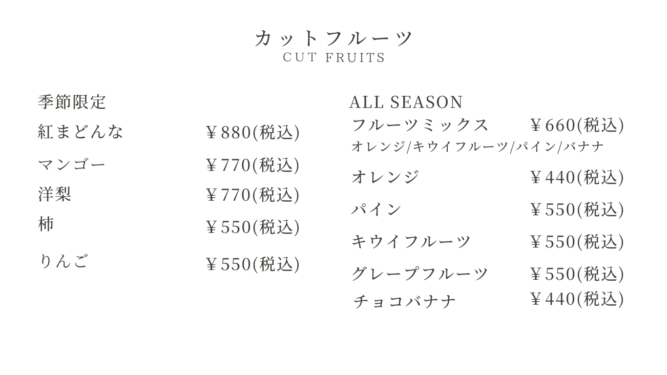 パフェやフルーツサンド、ジュースがお楽しみ頂けます