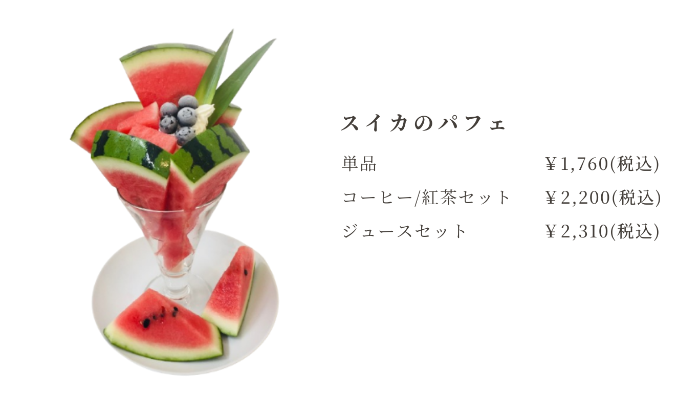 パフェやフルーツサンド、ジュースがお楽しみ頂けます